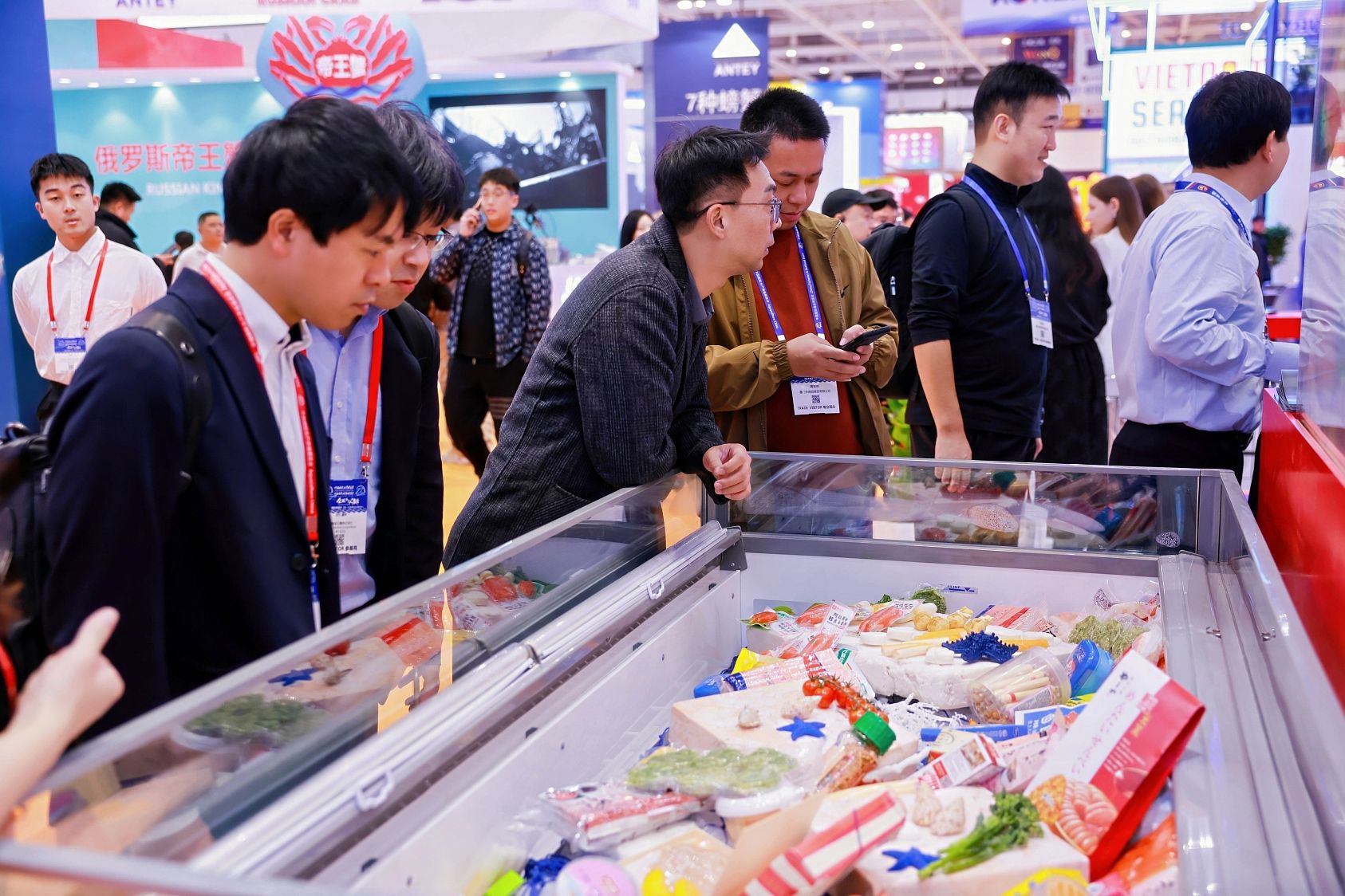 在这场国际性展会上,俄罗斯渔业公司重点展示了野生白鱼(明太鱼)系列产品,包括精深加工的鳕鱼排、鱼糜及鱼子制品。展台前参观者络绎不绝,对公司及其亚洲加工合作伙伴推出的鱼丸、鱼肠、火锅鳕鱼块、鱼糕等创新产品表现出浓厚兴趣。特别引人注目的是以传统鸣钟仪式开启的鳕鱼子零食品鉴环节,成为全场焦点。